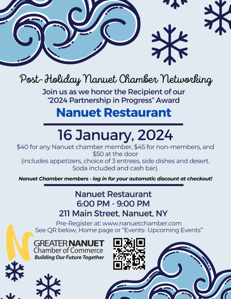 Greater Nanuet Chamber Post-Holiday Networking Event Postponed January 17, 2024 By Joel Manoj Update: Postponed Due to Snow New Date: January 23 at 6:00 PM (Tuesday)