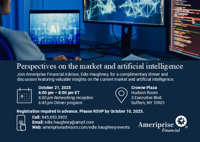 Suffern, NY – Edie Haughney, Ameriprise Financial Advisor, will be hosting a complimentary dinner and discussion on the current market and artificial intelligence on Tuesday, October 21st at the Crowne Plaza in Suffern.