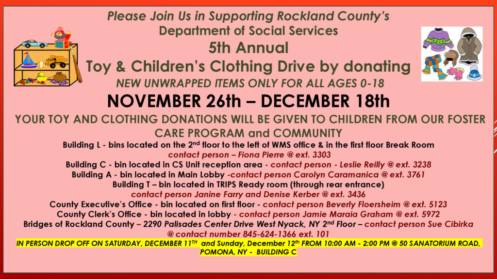 The Orangeburg Volunteer Fire Department is holding a toy drive. Toys will be distributed to South Orangetown Central School District’s Family Resource Center, Nyack Valley Cottage School District’s Family Resource Center and The Center for Safety & Change.