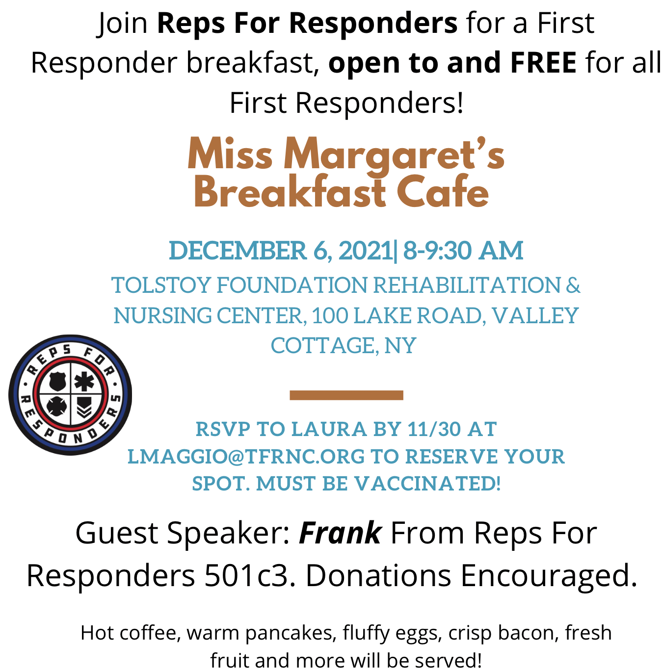 Tolstoy Foundation Rehab and Nursing Center 100 Lake Road, Valley CottageJoin us for a hot breakfast and featured speaker, Founder and President Frank Voce, Reps For Responders. This organization is a 501c3 organization offering free services to our First Repsonders. This information is invaluable to all those who are or know a Veteran, Police Officer, Fire Dept. officers/staff, doctors, nurses, CNA's, EMT's.