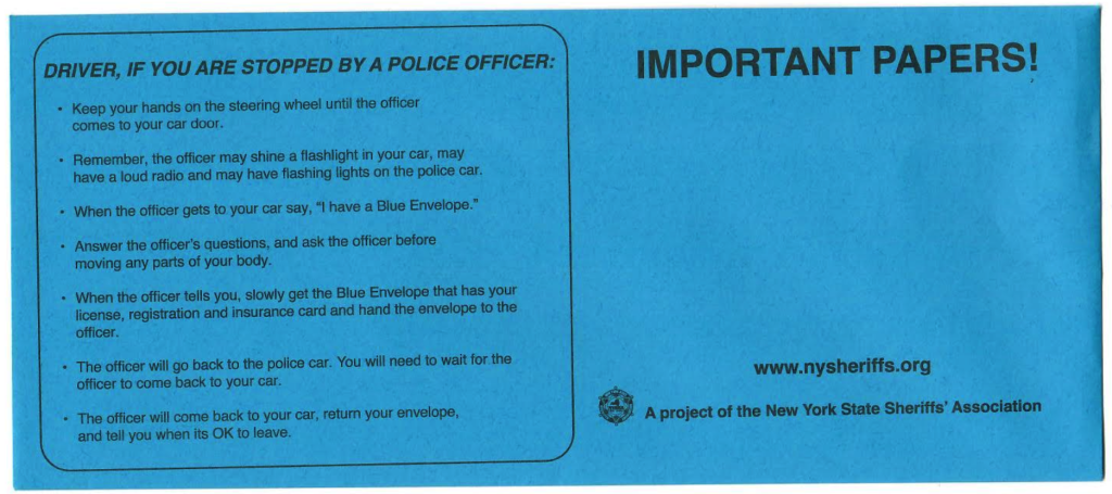 The New York State Sheriffs’ Association is promoting the Blue Envelope Program across the state, with multiple Sheriff’s Offices—including Rockland County—implementing it. Falco is also encouraging law enforcement officers throughout the county to recognize and respect the significance of the Blue Envelope when presented by a driver.