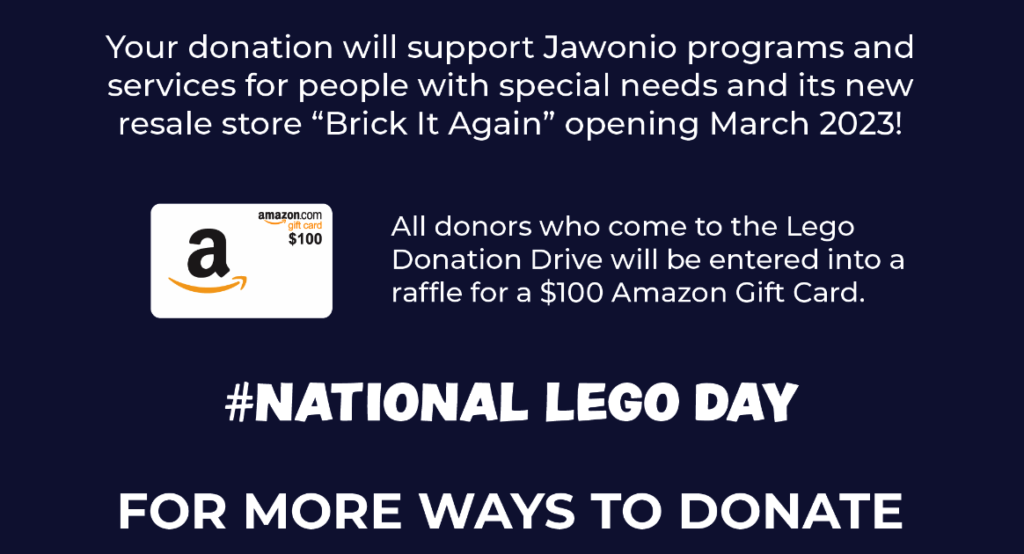 All Donors who bring the Lego products for donation on Saturday will be entered into a raffle for a $100 Amazon Gift Card.