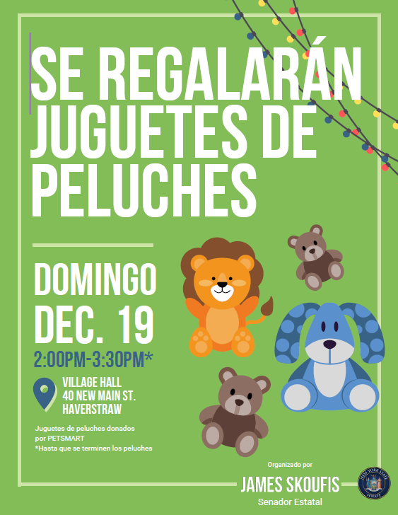 Senator James Skoufis (D-Hudson Valley) will host a stuffed animal giveaway at the Haverstraw Village Hall at 40 New Main Street on Sunday, December 19 from 2:00pm to 3:30pm.