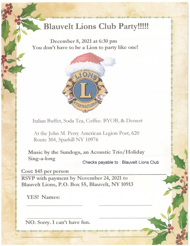 The Blauvelt Lions Club will host a party on December 8th at 6:30pm.