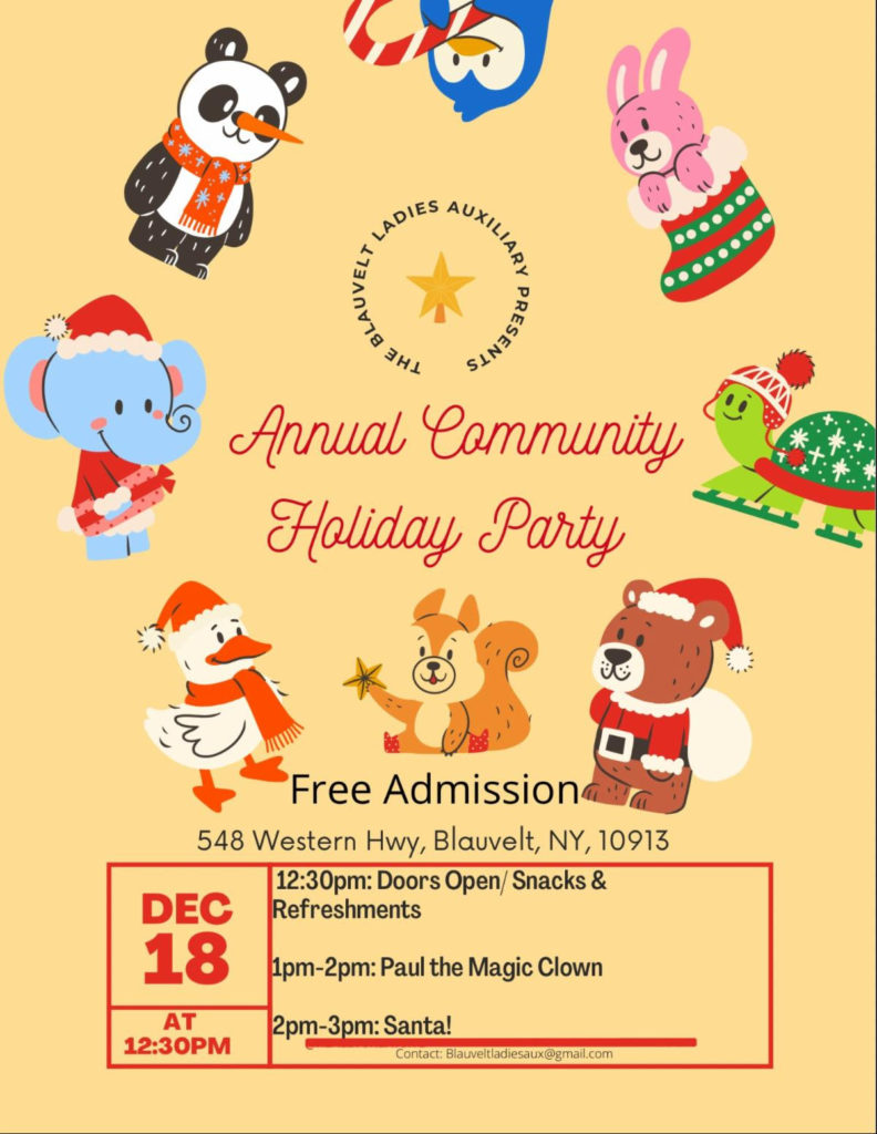 The Blauvelt Ladies Auxiliary will be hosting its annual Community Holiday Party on Saturday, December 18th at 12:30pm at 548 Western Highway in Blauvelt.