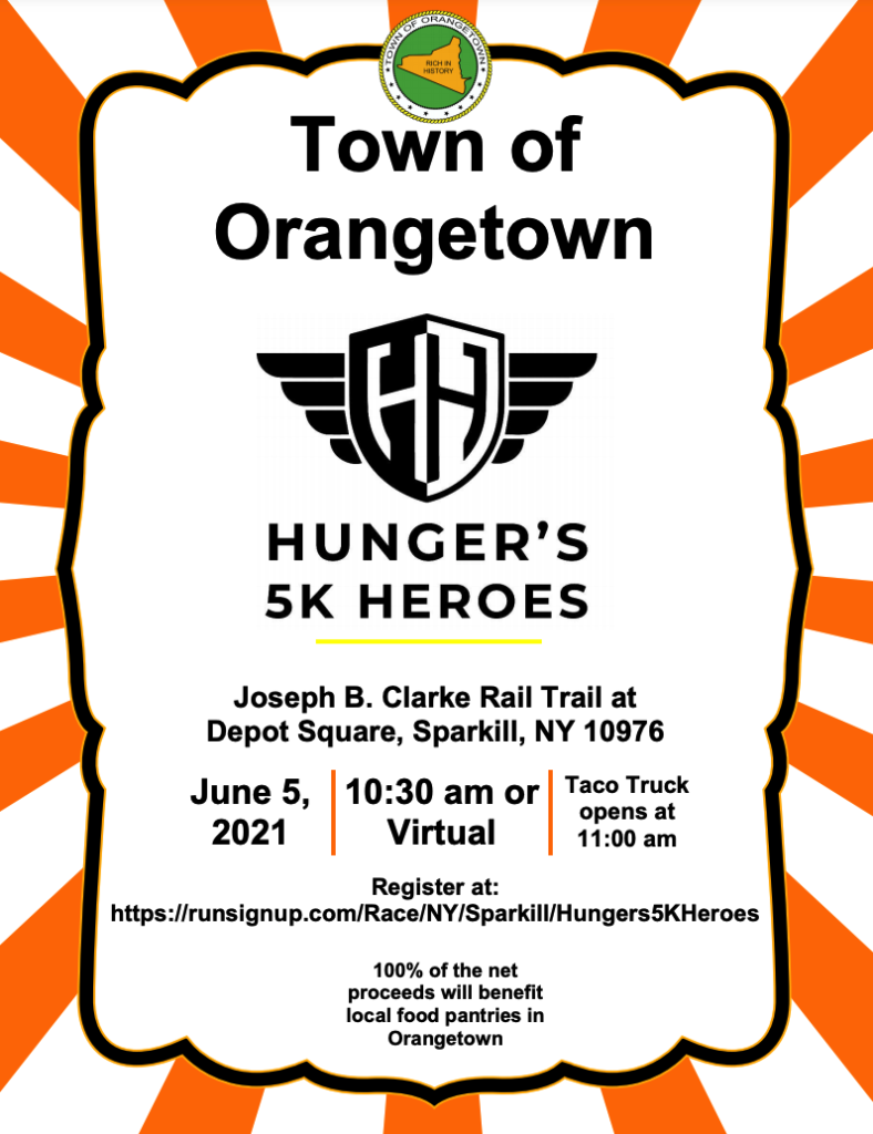 Hunger’s 5K Heroes will be held on Saturday, June 5th at 10 am at the Joseph B. Clarke Rail Trail in Sparkill, as well as virtually. Click here to register. All proceeds to benefit food pantries in the Town of Orangetown.