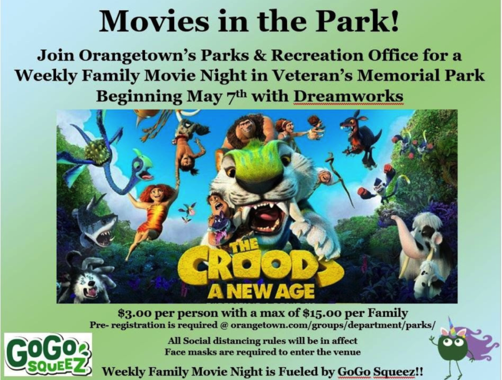 Orangetown Parks and Recs are just one week from the opening of their Friday Family Movie Series. They are happy to welcome GoGo Squeez as their corporate partner this year. They will be providing some handouts at many of the movie nights! The movies at Veteran’s Memorial Park are shown on a new 16’ X 10’ outdoor movie screen with a surround sound system. The May 7th movie is Dreamwork’s The Croods: A New Age.