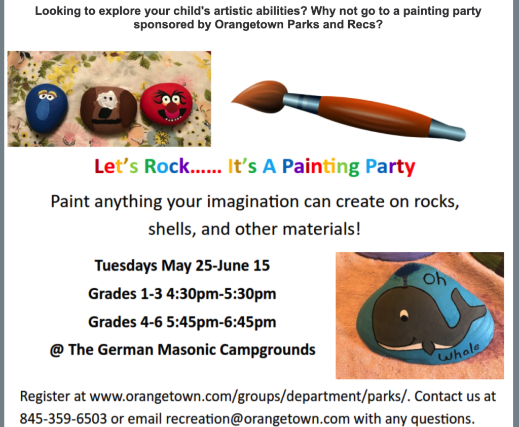 The Town of Orangetown Parks and Recreation Department is hosting a series of painting parties for children on Tuesdays from May 25th through June 15th. Click here to register.