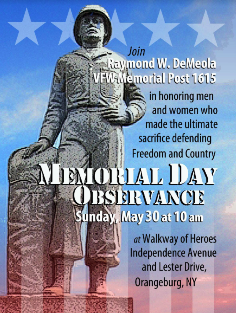 The Raymond W. DeMeola VFW Memorial Post 1615 will be holding a Memorial Day observance on Sunday, May 30th, at 10 am at the Walkway of American Heroes in Orangeburg.