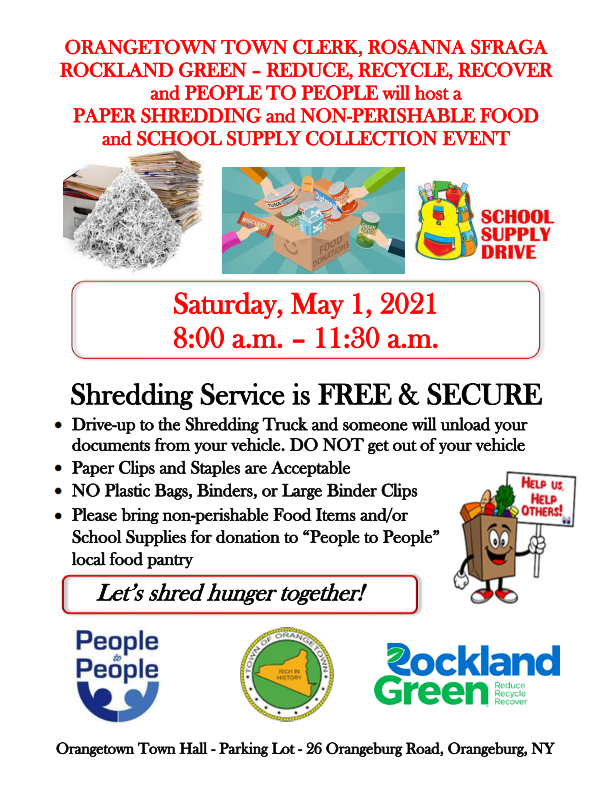 Orangetown Town Clerk Rosanna Sfraga, along with Rockland Green – Reduce, Recycle, Recover and People to People, will host a paper shredding and non-perishable food and school supply event on Saturday, May 1, 2021 in the parking lot of the Orangetown Town Hall from 8 am until 11:30 am.