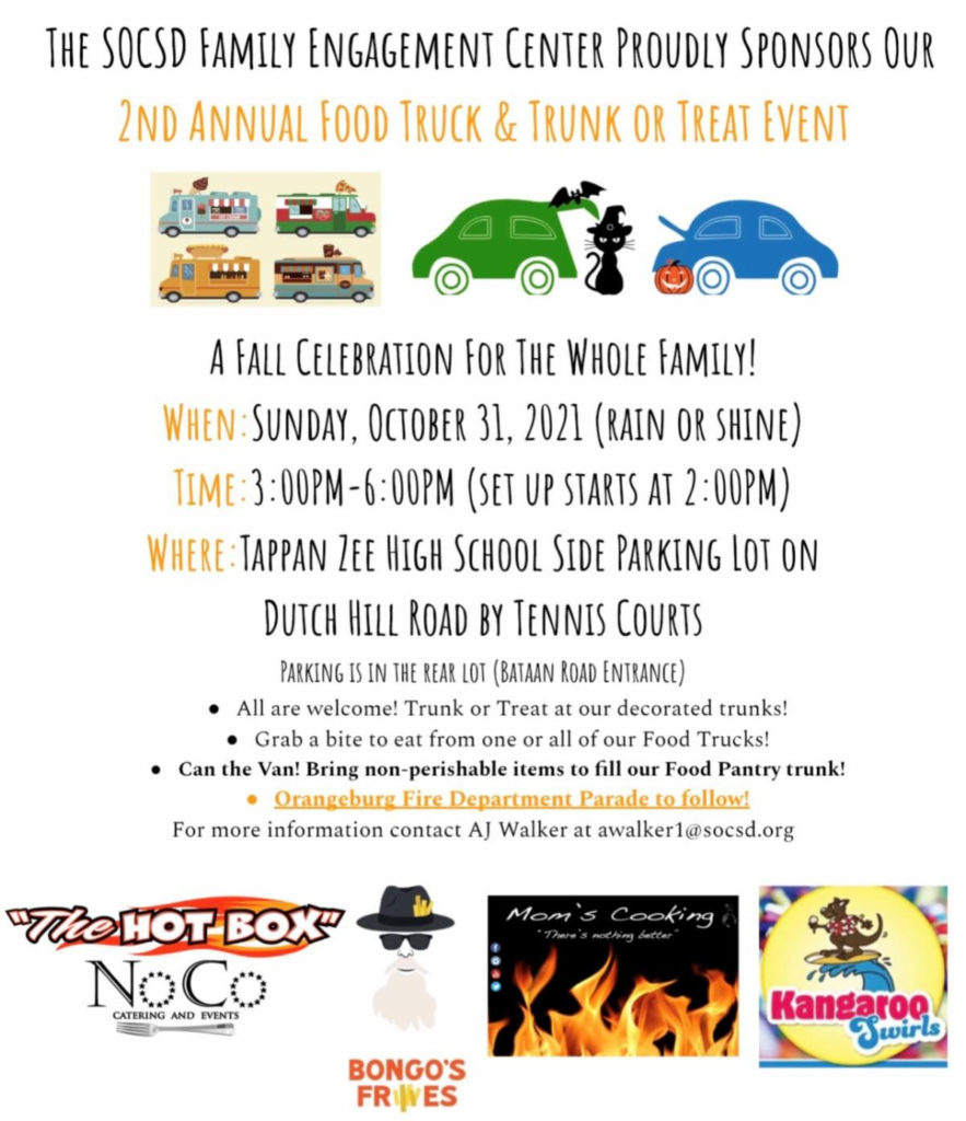 The South Orangetown Central School District Family Engagement Center is sponsoring its 2nd Annual Food Truck & Trunk or Treat Event on Sunday, October 31st at Tappan Zee High School.