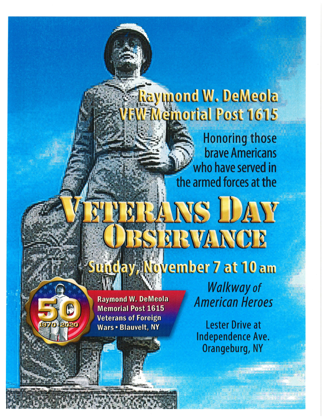 The Raymond W. DeMeola VFW Memorial Post 1615 will be hosting a Veterans Day Observance on Sunday, November 7th at the Walkway of American Heroes in Orangeburg.