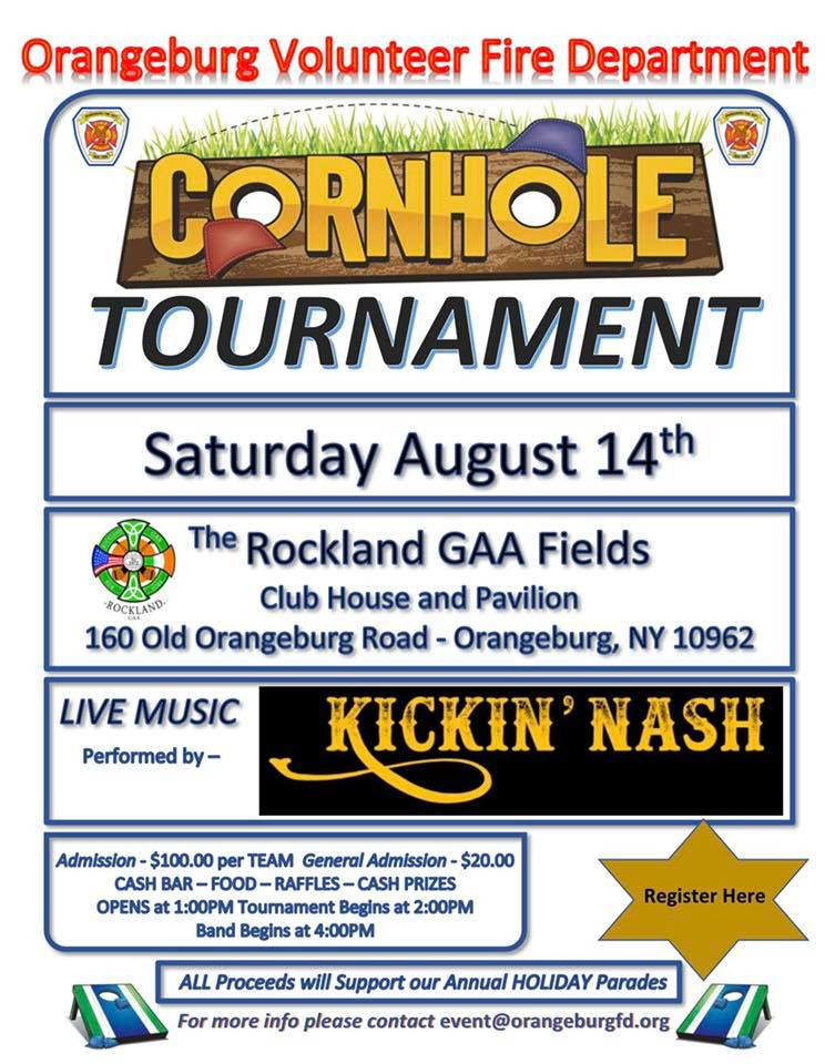 The Orangeburg Volunteer Fire Department will be hosting a Cornhole Tournament on Saturday, August 14th at the Rockland GAA Fields in Orangeburg.