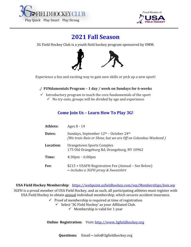 3G Field Hockey Club in Orangeburg is open for registration. Click here to register.