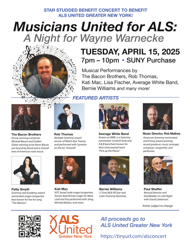 Purchase, NY – Don’t miss the star-studded benefit concert to support ALS United Greater New York on Tuesday, April 15, 2025, from 7:00 p.m. to 10:00 p.m. at SUNY Purchase. This incredible night will feature musical performances by renowned artists, including The Bacon Brothers, Rob Thomas, Kati Mac, Lisa Fischer, Average White Band, Bernie Williams, and more!