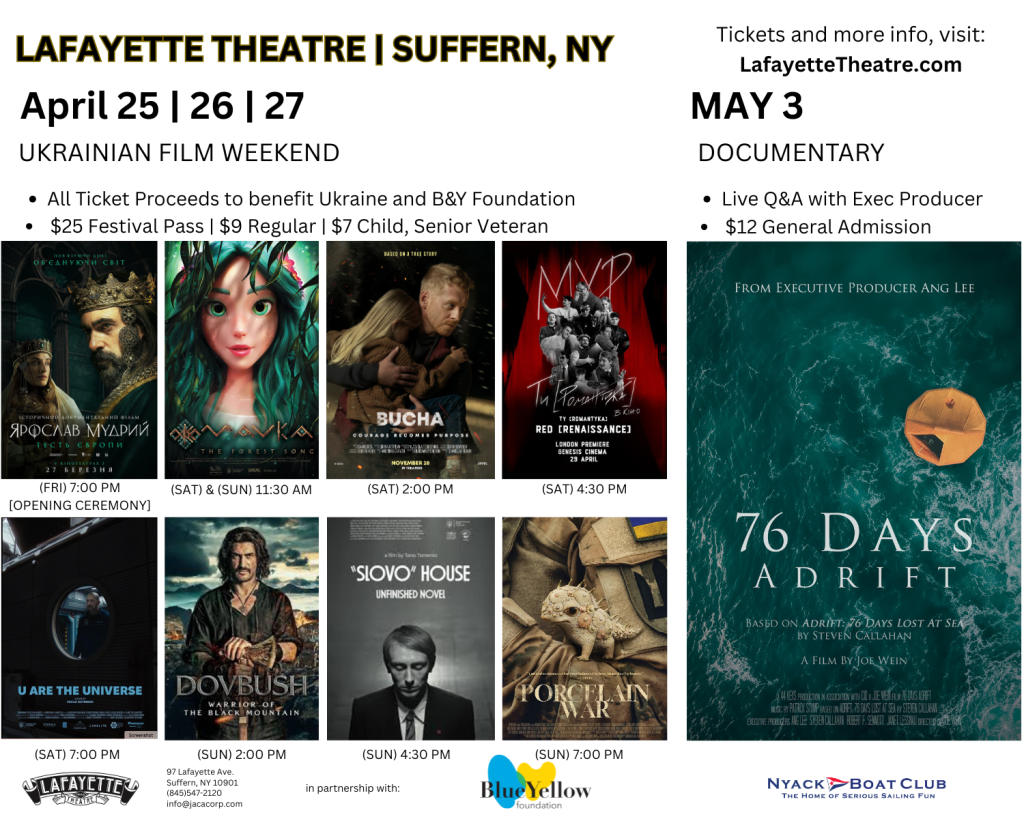 SUFFERN, NY – On the last weekend of April 2025, the Lafayette Theatre will host a powerful three-day Ukrainian Film Festival, using the art of cinema to highlight both the beauty and resilience of Ukrainian culture. From Friday, April 25 through Sunday, April 27, the theater will screen a diverse lineup of films that reflect the country’s history, mythology, and current international struggles—all within the timeless atmosphere of one of Rockland County’s most cherished and historical venues.