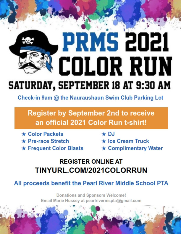 The Pearl River Middle School 2021 Color Run will take place on Saturday, September 18th at 9:30 am. Check in will be at 9am at the Nauraushaun Swim Club Parking Lot. All proceeds wills benefit the Pearl River Middle School PTA.