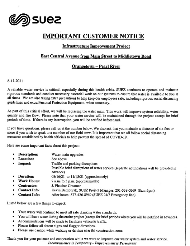 Suez released the following information regarding its Infrastructure Improvement Project on East Central Avenue from Main Street to Middletown Road in Pearl River.