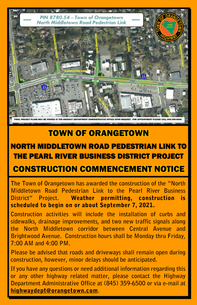 Construction is set to begin on or around September 7th to the North Middletown Road Pedestrian Link to the Pearl River Business District project.