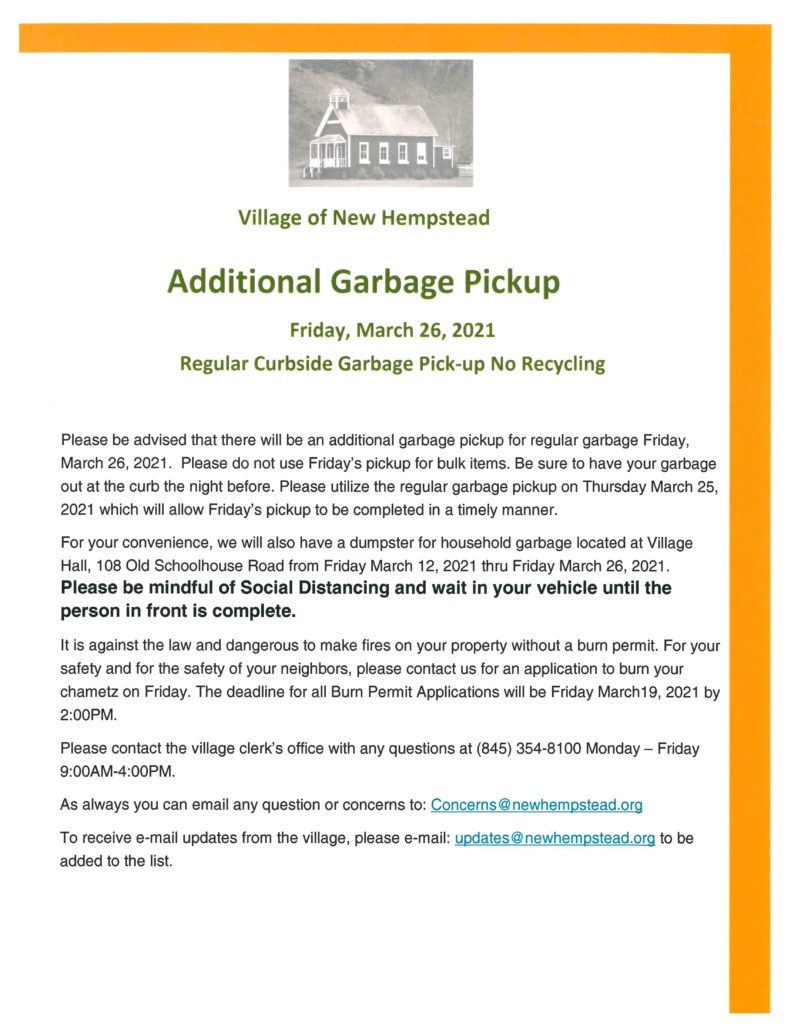 Please be advised that there will be an additional garbage pickup for regular garbage Friday, March 2, 2021. Please do not use Friday’s pickup for bulk items. Be sure to have your garbage out at the curb the night before. Please utilize the regular garbage pickup on Thursday March 25, 2021 – which will allow Friday’s pickup to be completed in a timely manner.